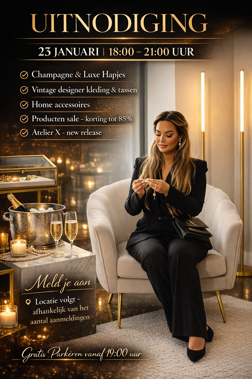 Op Vrijdag 23 januari ben je welkom bij Atelier X Experience in Amsterdam. Tussen 18:00 en 21:00 uur ontvang ik je in mijn atelier aan de Maassluisstraat Amsterdam voor een exclusief moment met champagne, luxe hapjes en een preview van de nieuwste pieces.