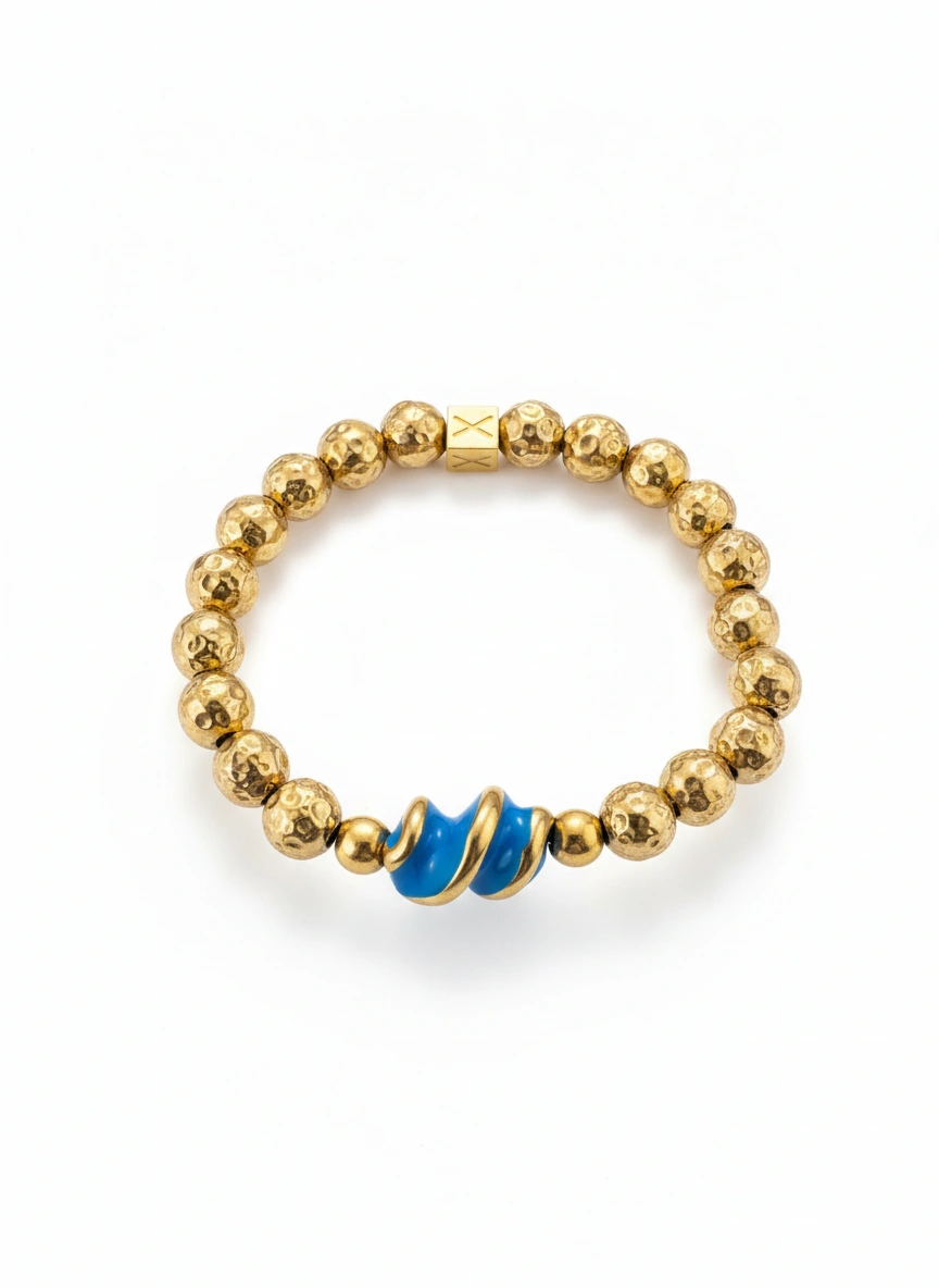 Azure Signature is een statement piece binnen de Statement Collection van Atelier X. Warm goud wordt doorbroken door een intense blauwe kern — symbool voor kracht, focus en eigenheid. Het goud omarmt de kleur in een vloeiende vorm, waardoor spanning en elegantie samenkomen.