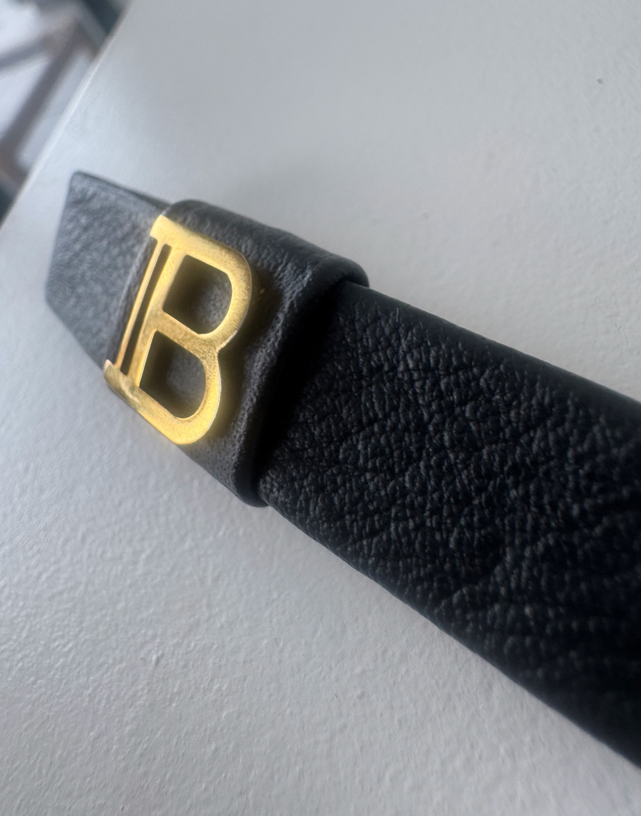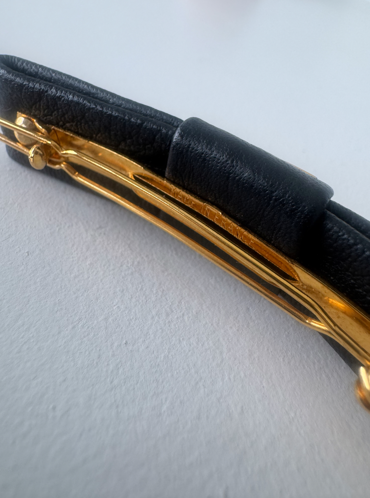 Elegantie in eenvoud: deze vintage haarclip van Balmain Paris combineert luxe zwart leer met een gouden “B”-embleem. Het stuk is subtiel gemerkt Made in France en straalt de klassieke Parijse chic uit.