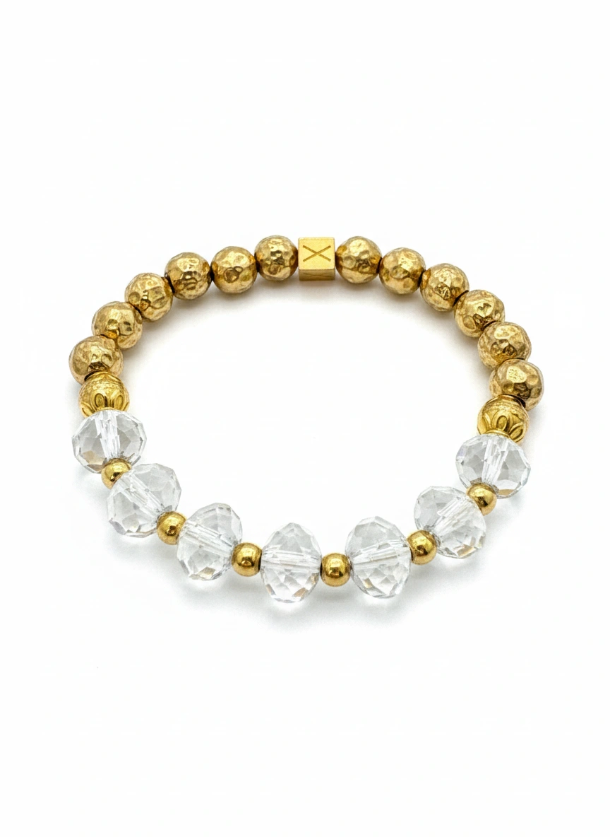 Deze armband is met de hand vervaardigd en maakt deel uit van de Atelier X collectie – Made From Memories. De combinatie van zorgvuldig geselecteerde goudkleurige kralen en heldere crystal stones staat voor balans, kracht en verfijning. Elk detail is bewust gekozen en met precisie afgewerkt.