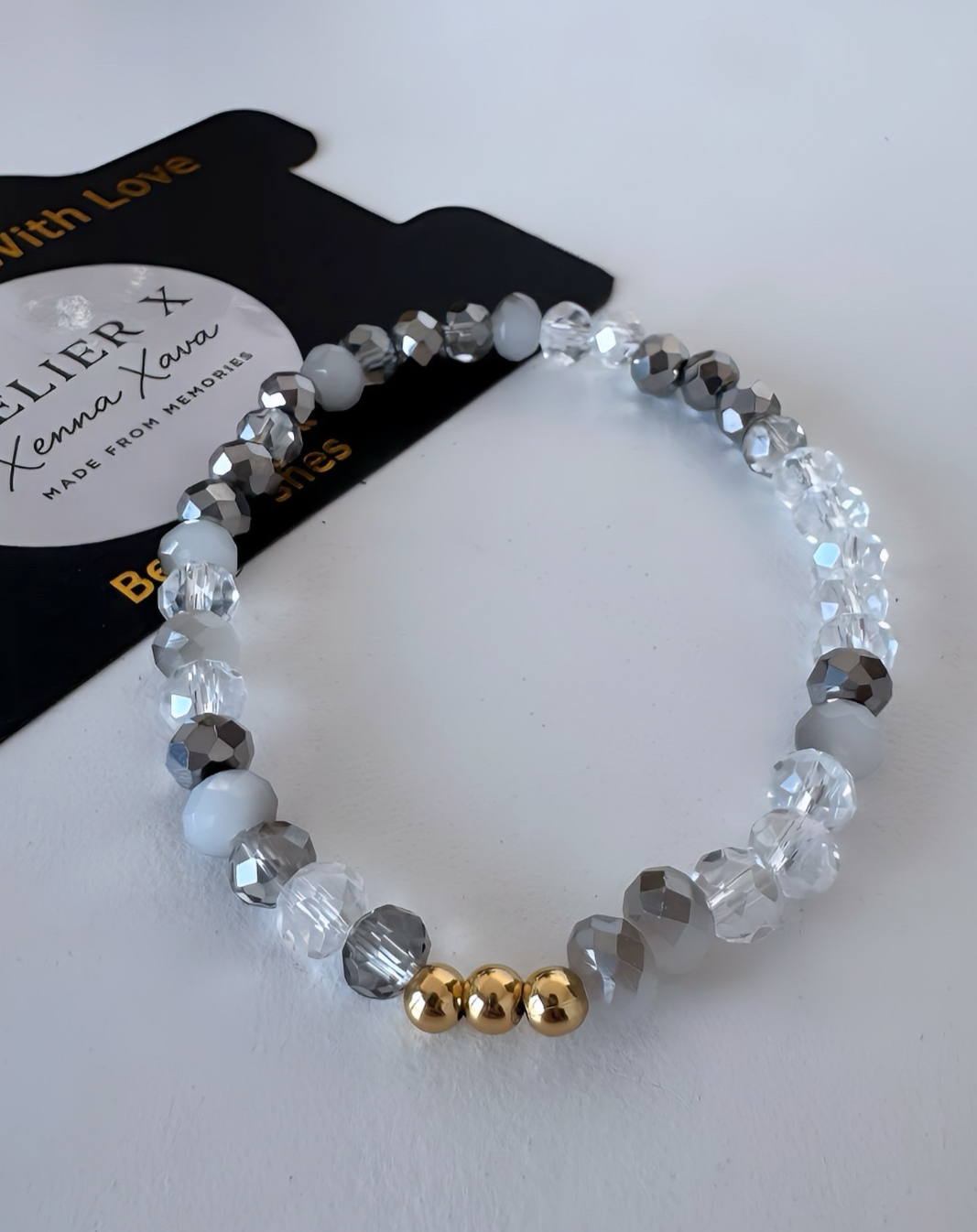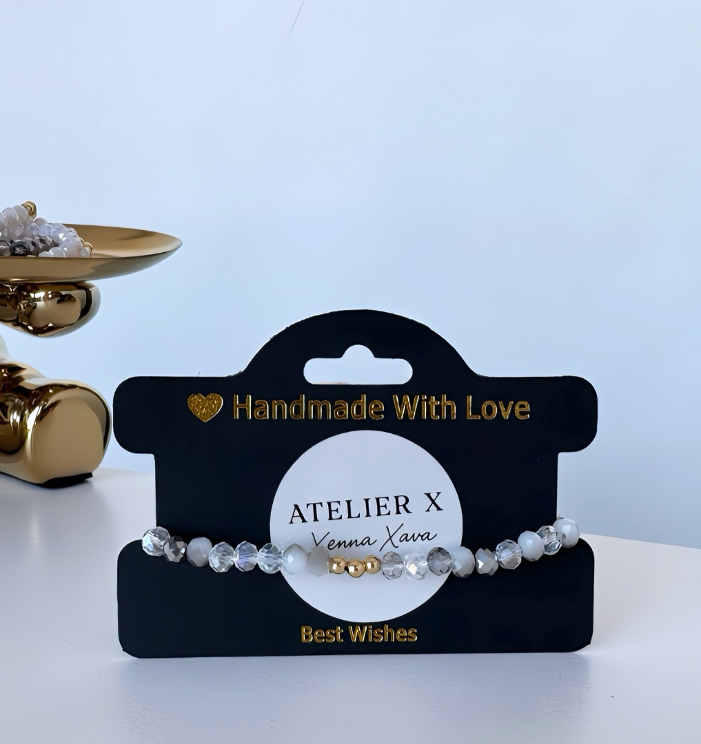 Een verfijnde armband waarin glanzende kristallen en zilvergrijze tinten samenkomen met gouden kralen als stralend middelpunt.
