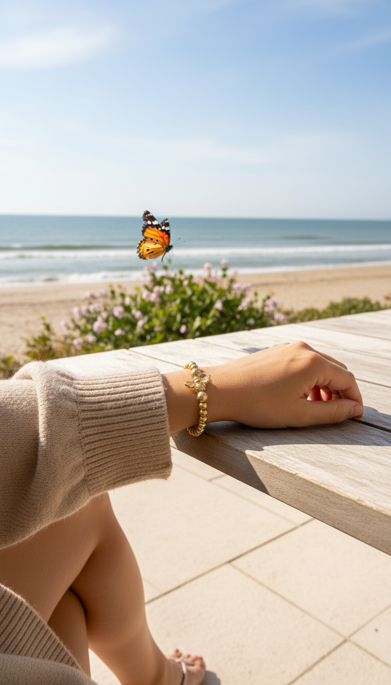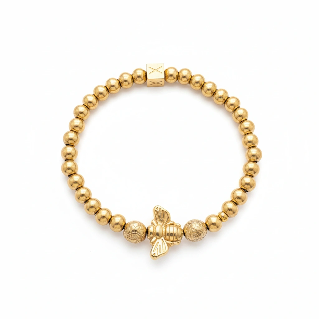 Het ontwerp straalt rust en zelfverzekerde luxe uit. De gouden kralen vormen samen een krachtig geheel, terwijl de bij het sieraad zijn unieke signatuur geeft. Geen trends, geen overdaad, alleen blijvende klasse.