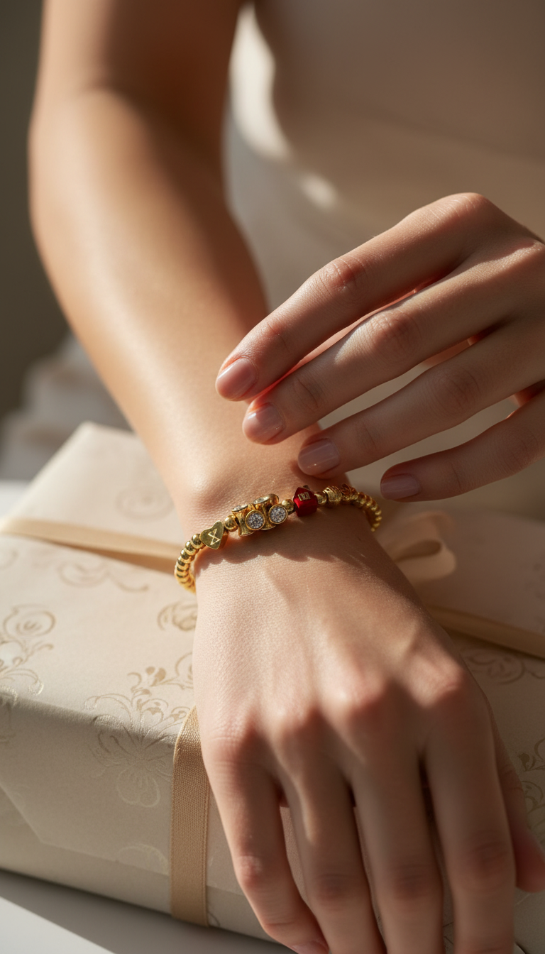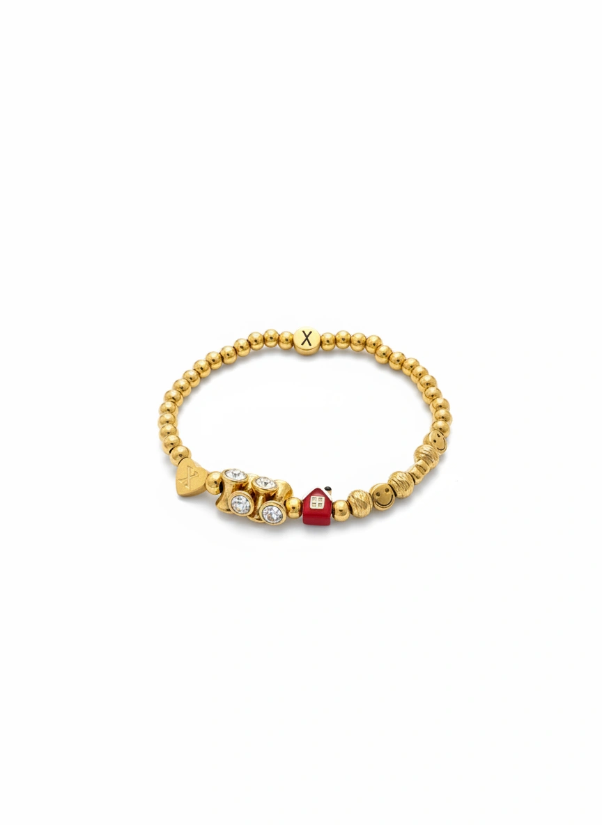 De combinatie van handgezette kristallen, de iconische rode huis-bedel en subtiele gouden details maakt deze armband een echt conversation piece — een sieraad dat verhalen draagt en karakter uitstraalt.