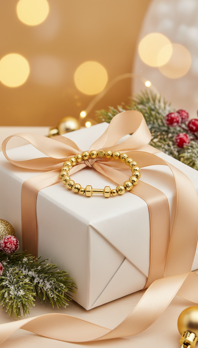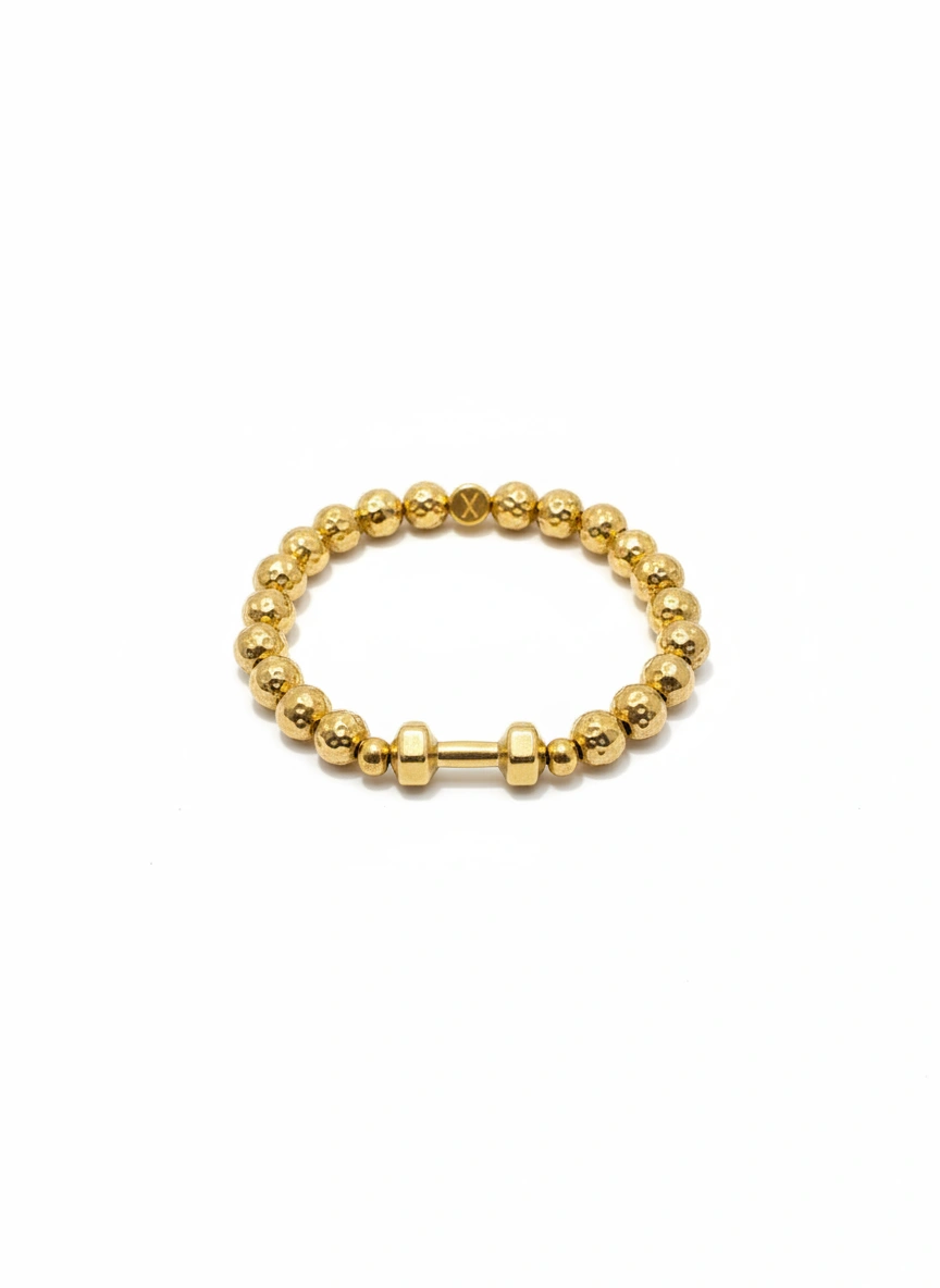 Elke bead is zorgvuldig geselecteerd in warm goudkleurig design, met centraal de herkenbare Atelier X dumbbell-bedel: een subtiele ode aan discipline, focus en de lifestyle die Gym Forty Five definieert.