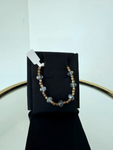 Een speelse mix van facetgeslepen kristalkralen, warme goudbruine accenten en een elegante parel als subtiel detail.