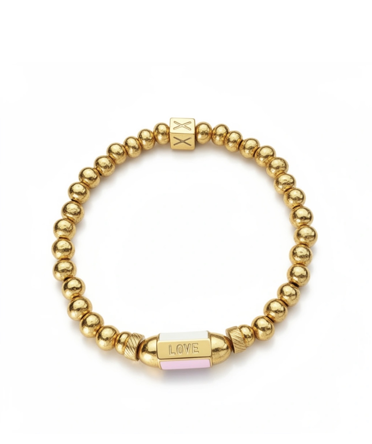 De armband is een verfijnd sieraad dat elegantie en betekenis samenbrengt. De armband bestaat uit 6 mm kralen en wordt afgewerkt met een subtiele LOVE centerpiece in zachte tinten wit, roze en paars, wat zorgt voor een warme en stijlvolle uitstraling die niet verkleurd.