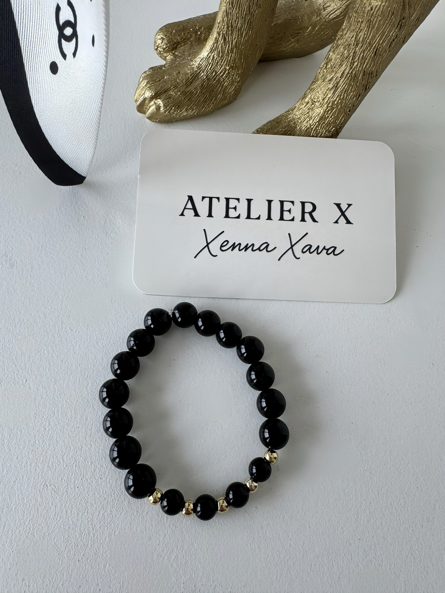 Deze armband is handgemaakt van echte zwarte onyxstenen, afgewerkt met subtiele bladgouden details.
