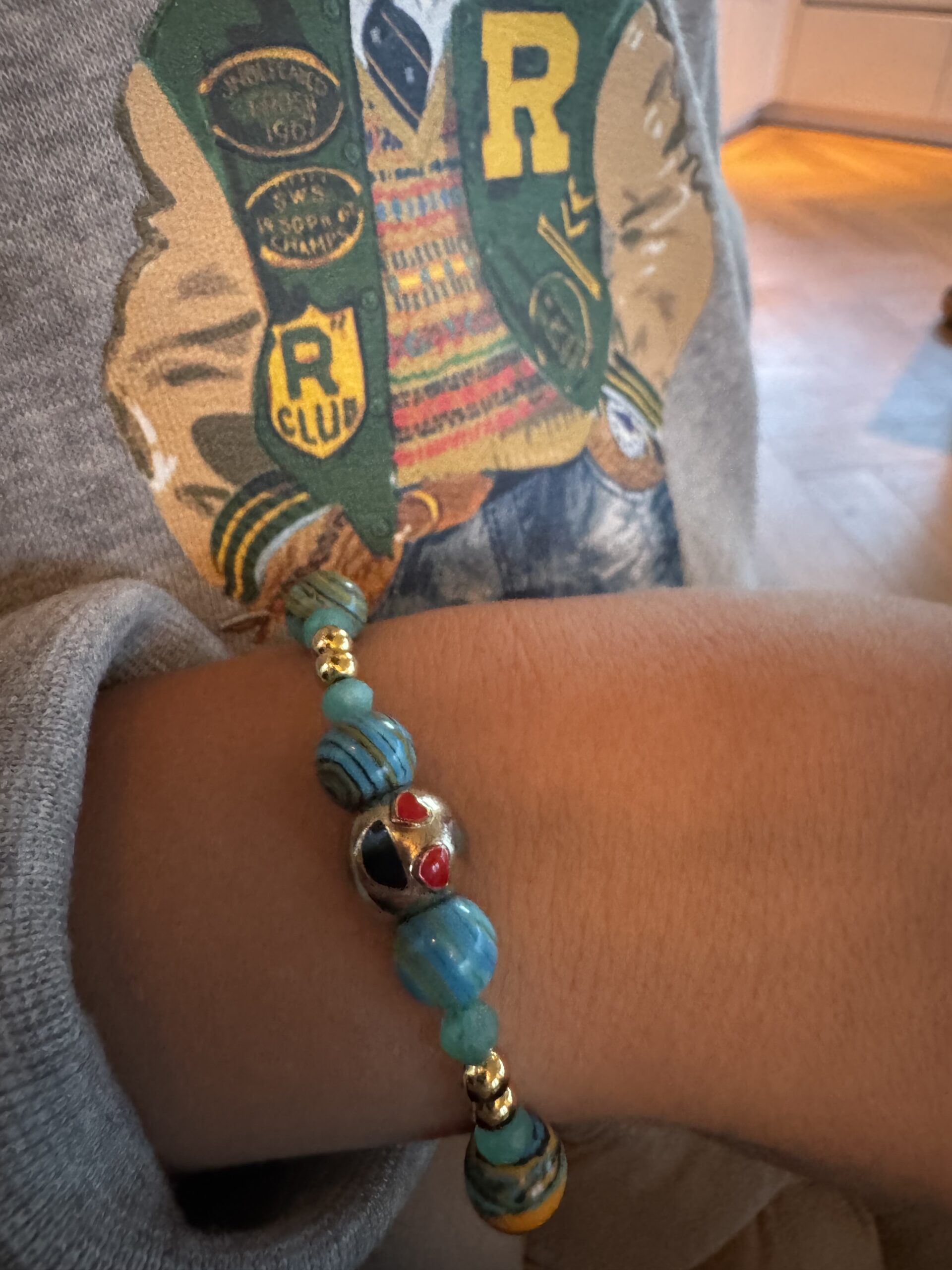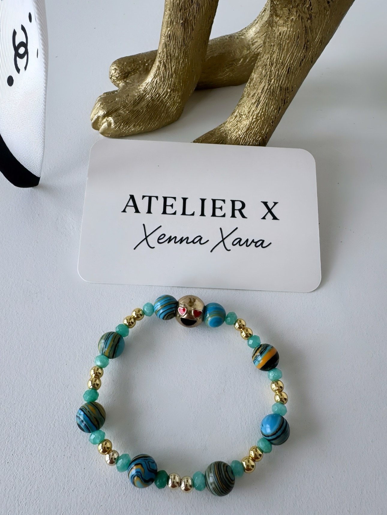 Een speelse armband met karakter — handgemaakt uit echte natuurstenen en verfijnd met bladgoud accenten.