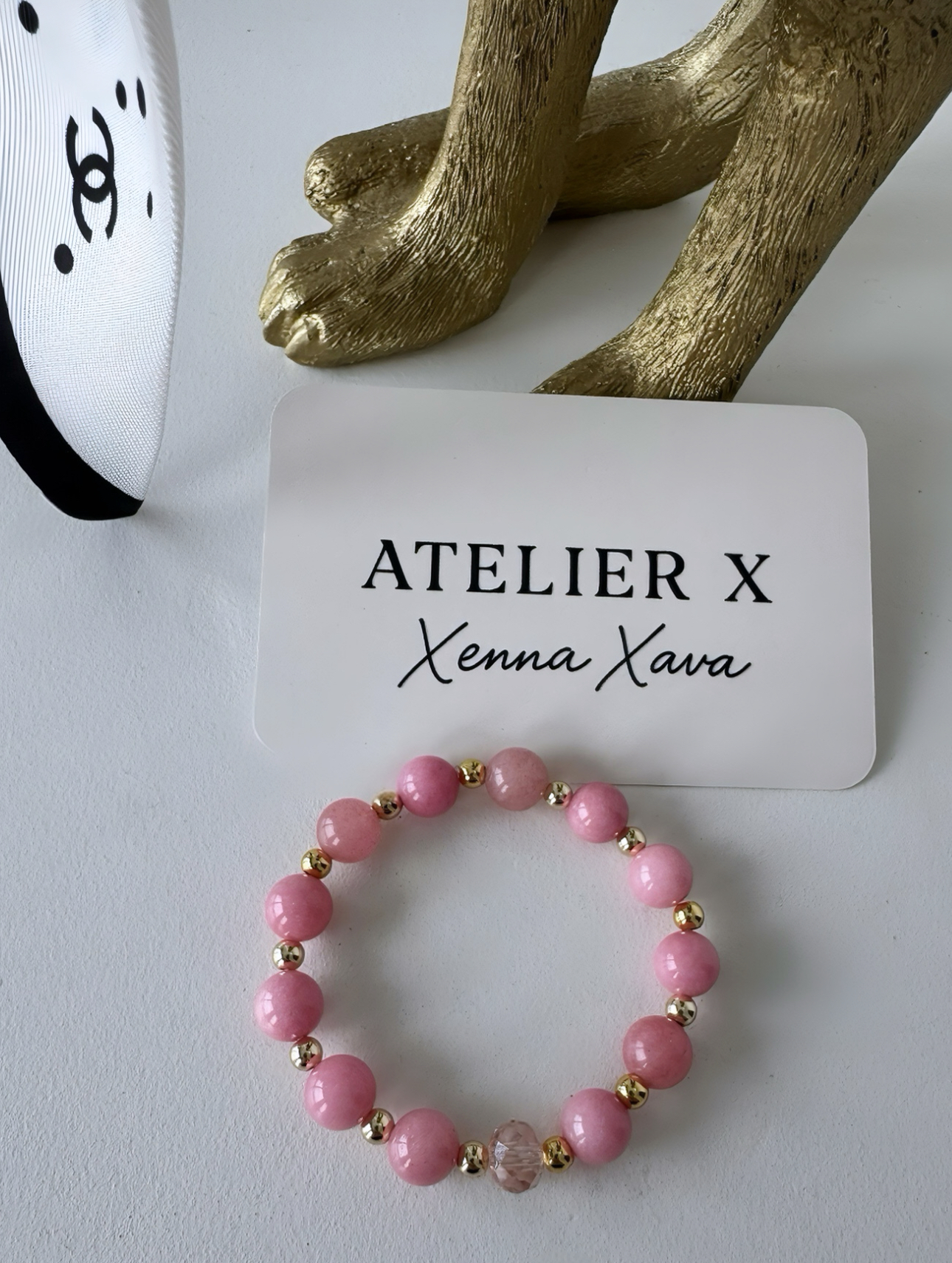 Handgemaakt met echte roze natuurstenen, verfijnd met bladgouden accenten en een opvallende smiley bead die elke outfit laat stralen.