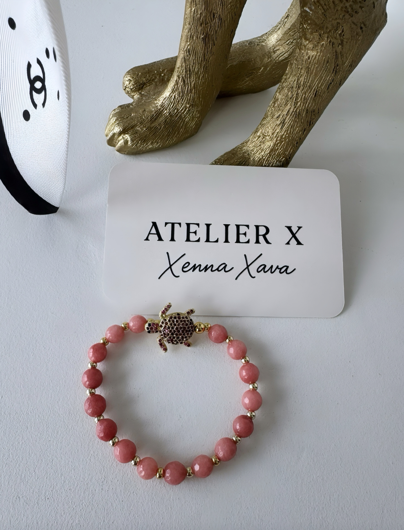 Handgemaakt met roze natuurstenen en verfijnd met bladgouden details.
