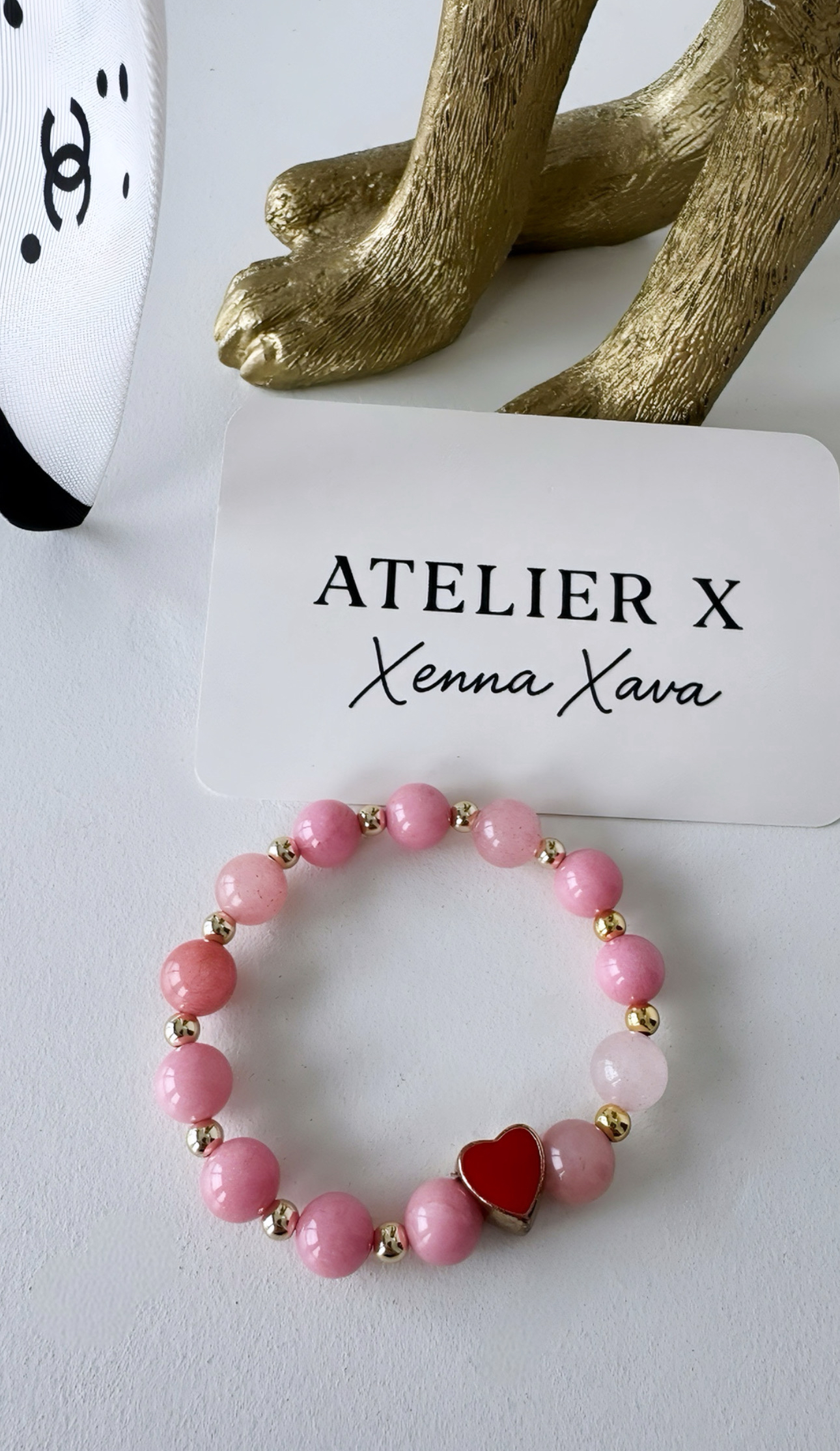 Deze armband is handgemaakt met roze natuurstenen, verfijnd met bladgouden details en afgewerkt met een opvallend rood hartaccent.