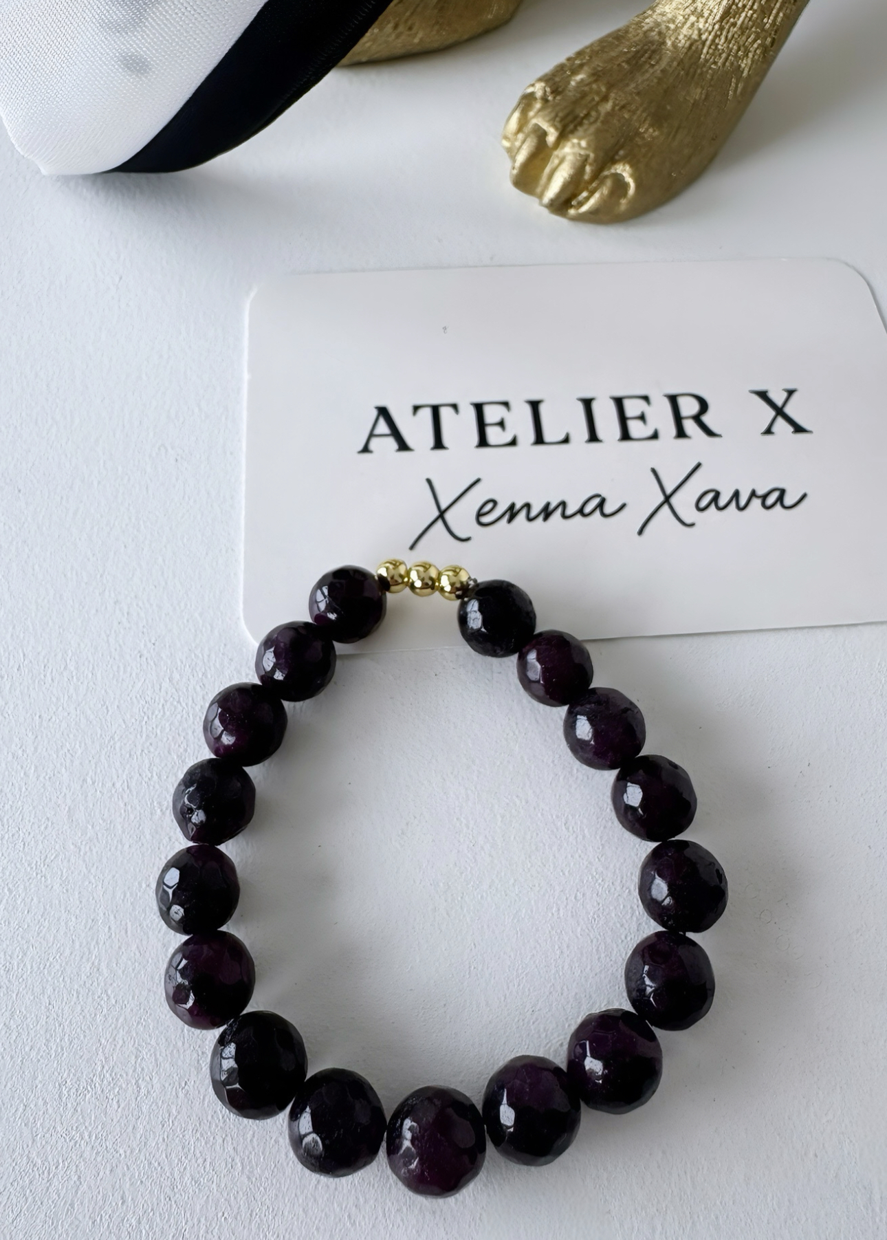 Met zijn diepe donkerpaarse natuurstenen en bladgouden details straalt deze armband pure klasse uit, terwijl hij tegelijk symbool staat voor bescherming, creativiteit en zelfvertrouwen.
