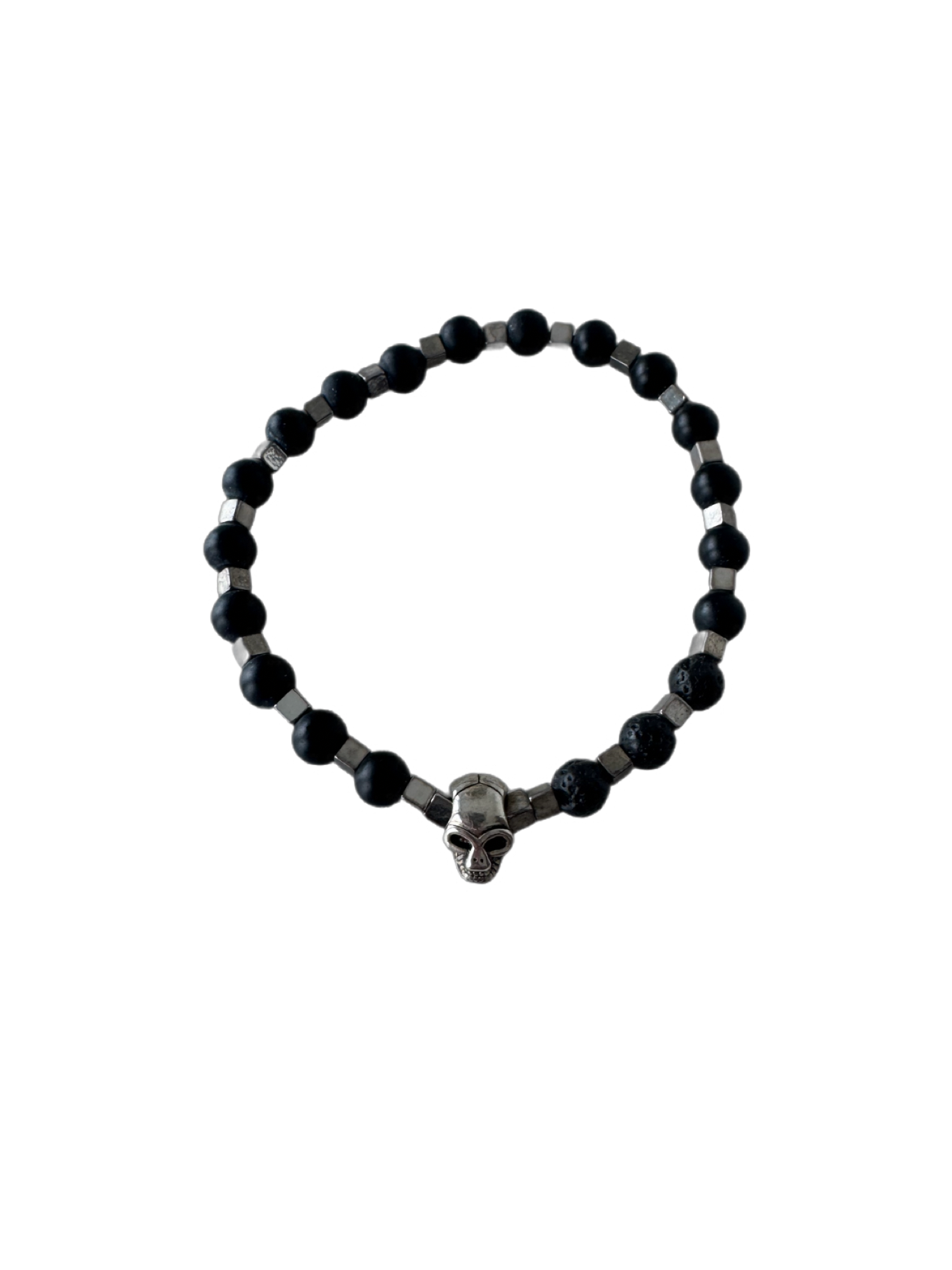 Deze armband is gemaakt met matte zwarte stones, gecombineerd met metalen hexagon beads en een opvallende skull-bedel. Minimalistisch, maar met precies genoeg edge — een perfecte toevoeging aan de Rockstar X Men collectie.