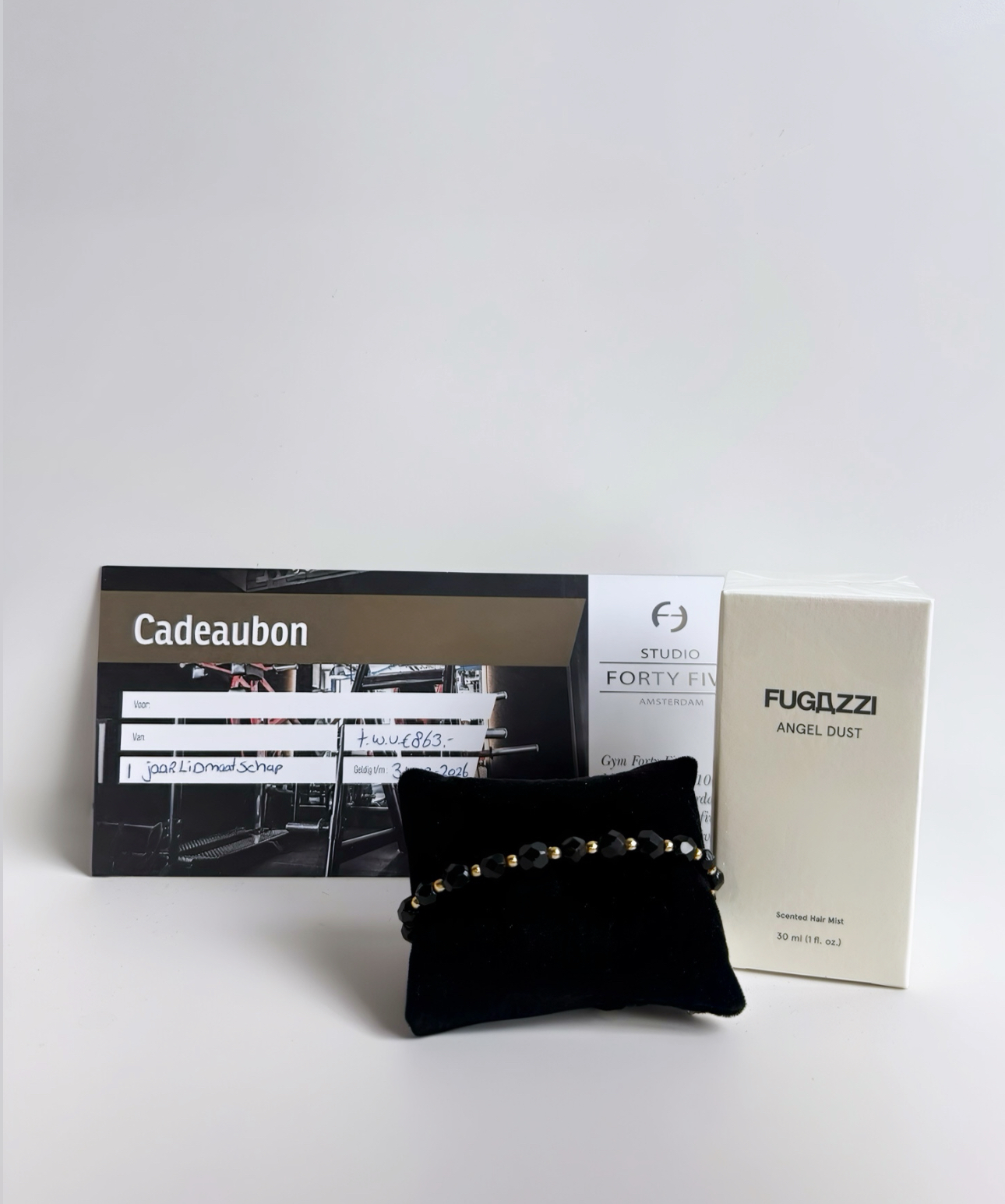 Deze set combineert luxe verzorging, exclusieve accessoires en het ultieme fitnesslidmaatschap.