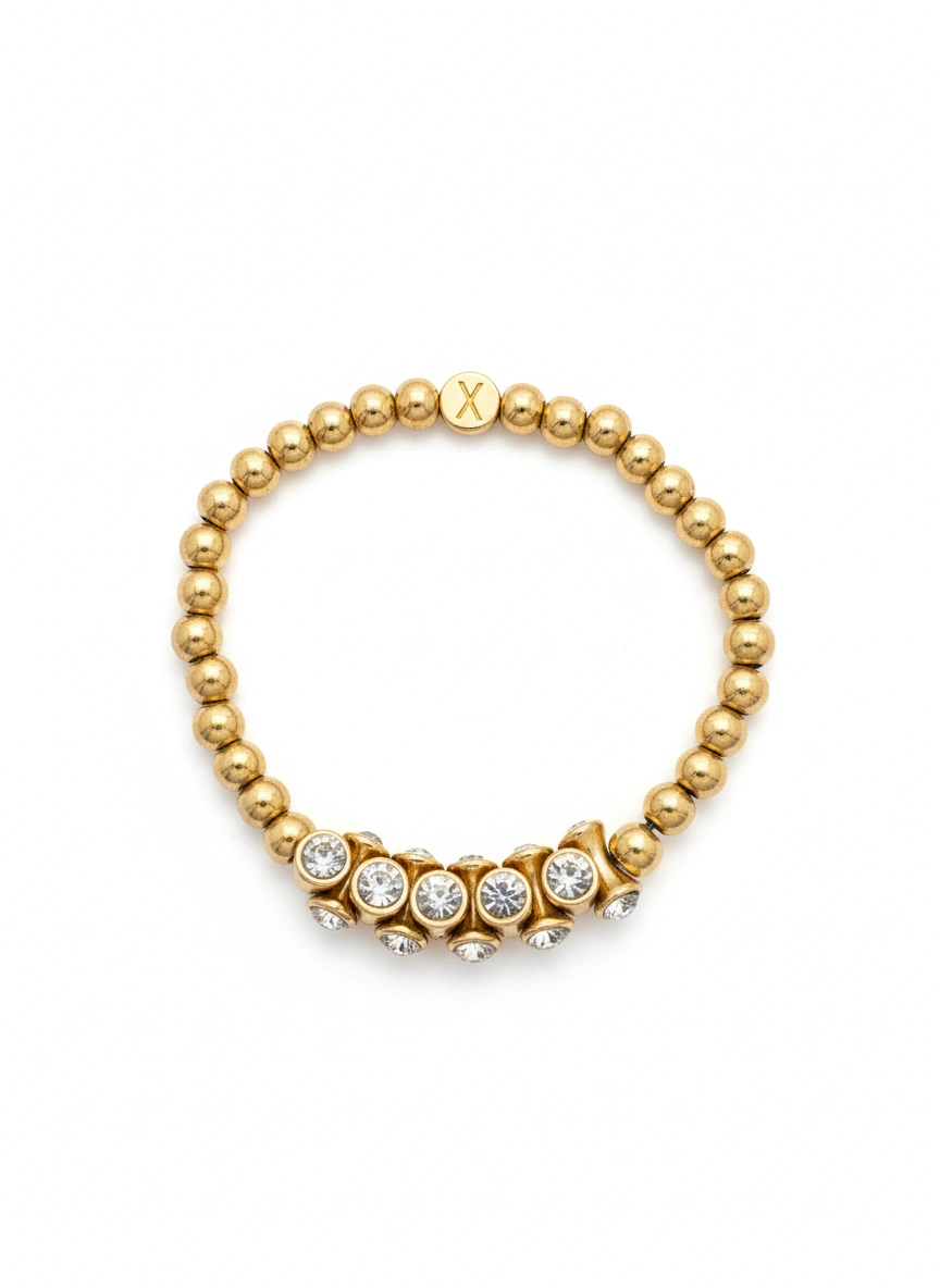 De massieve gouden kralen worden geaccentueerd door een statement middenstuk met fonkelende details, zorgvuldig geplaatst voor maximale impact. Elk ontwerp straalt zelfvertrouwen, luxe en karakter uit, een sieraad dat niet volgt, maar leidt.