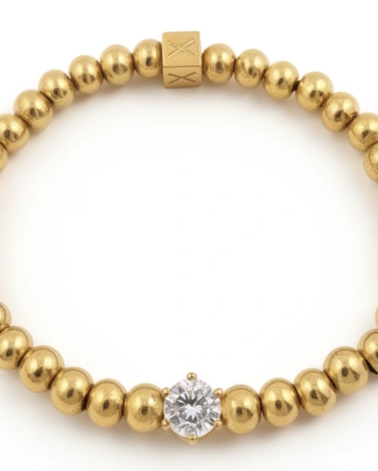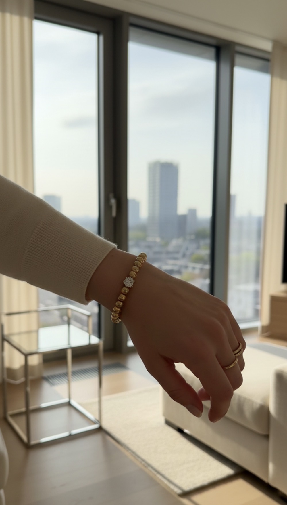 De 6mm gouden kralen creëren een elegante, minimalistische basis, terwijl de centrale zirkonia steen een zachte, heldere schittering toevoegt.